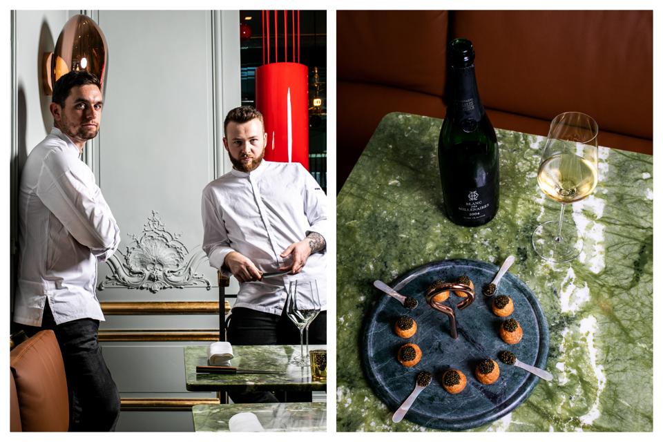 Po lewej stronie, skontrastuj kucharzy Kevin de Porre i Erwan Ledru w ich nowym stroju w Paryżu. Racja, kawior … hors d „oeuvre.